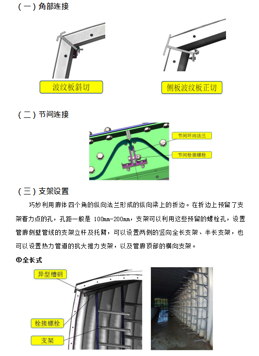 l 四個連接角為鈍角結構,沒有圓弧角的弧度卷圓限制,可以使用大波高、大慣性矩 的波紋鋼板,大大提高了廊體的強度,同樣的鋼材用量卻能使管廊板壁的慣性矩比“涵洞型” 波紋鋼管廊提高 5.3~7.7 倍;
