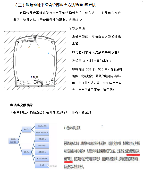 ⑨ 應對耐火極限三小時的方式是涂耐火涂料,但耐火涂料壽命只有 10~20 年, 并且不能長期耐潮,在壽命到期失效后重新涂刷時,由于內部管線及設施的存在, 清除殘余失效涂層的工作量大,涂刷新涂層更繁雜,費用較初次施工時大大增加, 并且在管廊整個壽命周期內要多次更換防火涂層;更為重要的是,耐火涂料只能阻止火災時鋼結構的溫度不高于 550℃,但對于鋼結構地下管廊來說情況特殊,在火災發(fā)生半小時左右,耐火涂料覆蓋的鋼結構體溫度就超過 150℃,廊體外部土壤中的水份形成高溫高壓蒸汽,其產生的次生災害有可能嚴重于火災本身。